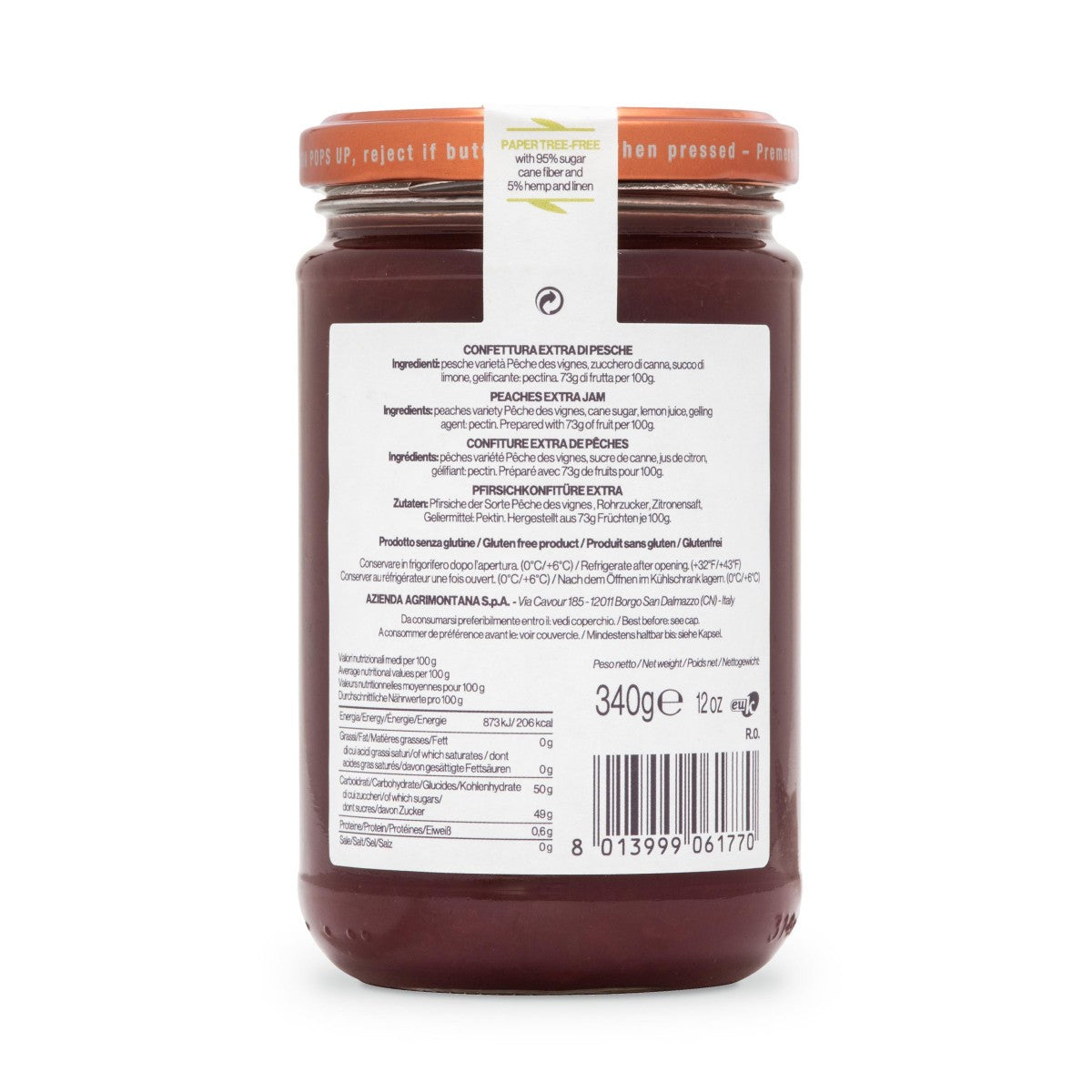 Confettura extra realizzata con pesche della varietà Pêche De Vigne, pesca caratterizzata dal colore rosso brillante e la sua buccia grigia. La pesca Pêche De Vigne ha una maturazione tardiva: infatti il momento di raccolta avviene nello stesso momento della vendemmia. Grazie al suo colore che ricorda il vino può essere conosciuta anche come "pesca settembrina". La pesca Pêche de Vigne è piccola, succosa nel sapore, dal gusto delicato. La dicitura "EXTRA", a norma di legge, garantisce l'utilizzo di sola frutta intera, l'assenza di anidride solforosa e conservanti.