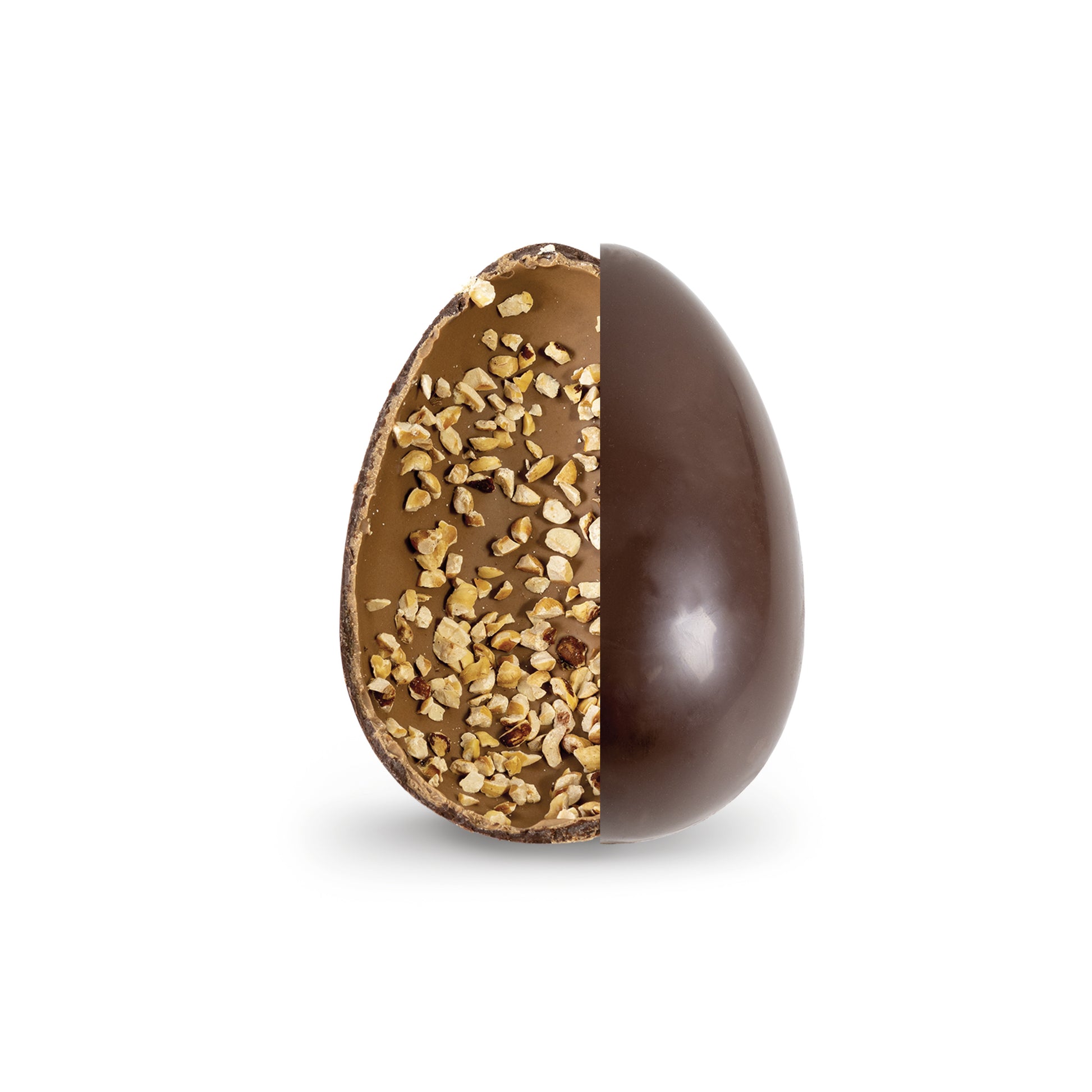 Un guscio esgterno in croccante cioccolato fondente e uin interno in morbido cremino, arrichito con una fitta granella di nocciole tostate